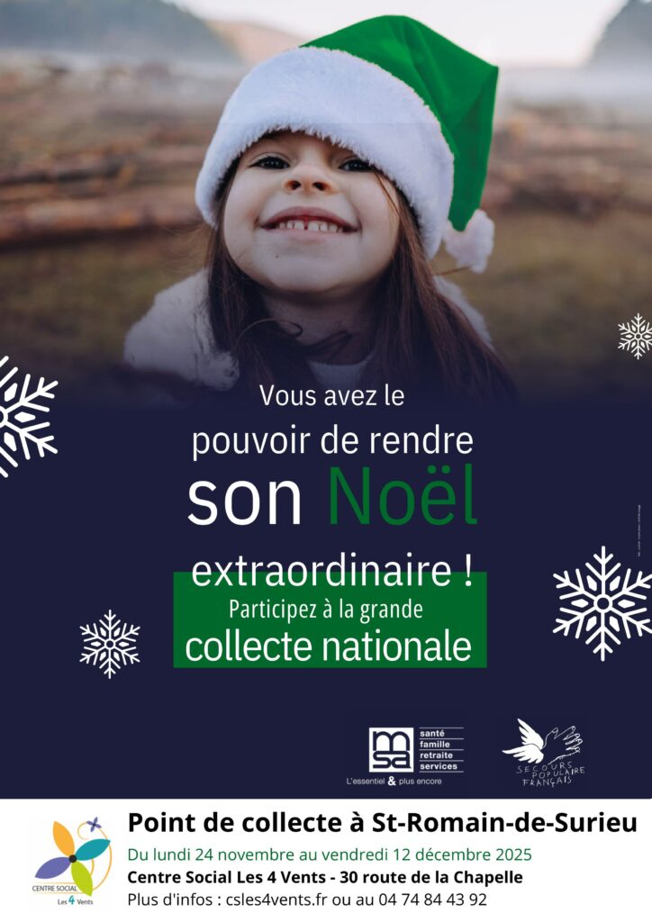 Le Centre Social Les 4 Vents, en tant que partenaire de longue date de la MSA Alpes du Nord, souhaite relayer cette initiative en proposant une collecte au niveau local du lundi 24 novembre au vendredi 12 décembre 2025, et ainsi proposer à ses adhérent.es, mais plus largement aux habitant.es des communes d’Assieu, La Chapelle-de-Surieu, Saint-Romain-de-Surieu et Ville-sous-Anjou de participer à cette grande collecte nationale.